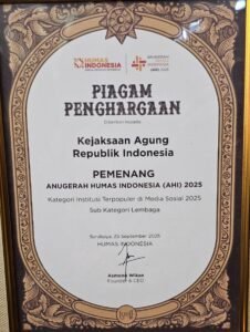 SURABAYA – Kejaksaan Agung Republik Indonesia (Kejagung RI) meraih penghargaan sebagai Institusi Terpopuler di Media Sosial dalam ajang Anugerah Humas Indonesia (AHI) 2025, yang digelar di JW Marriott Hotel, Surabaya, Kamis (25/9/2025).