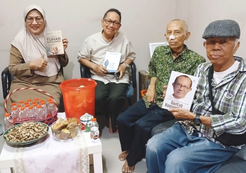 Setelah belasan tahun tak bertemu tatap muka, saya bersama istri Hj Diani Ratna Indrawati, dan sahabat lama kami Mas Ghoffar Ismail, akhirnya bisa bertemu dan berpelukan lagi dengan Gantyo Koespradono — wartawan senior, berusia 68 tahun, dan kini menjadi bisu akibat terkaman kanker yang ganas di laringnya.