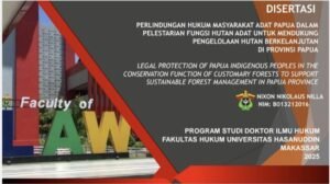 Tulisan ini adalah sebagian isi dari Disertasi penulis “PERLINDUNGAN HUKUM MASYARAKAT ADAT PAPUA DALAM PELESTARIAN FUNGSI HUTAN ADAT UNTUK MENDUKUNG PENGELOLAAN HUTAN BERKELANJUTAN DI PROVINSI PAPUA” sebagai syarat untuk memperoleh Gelar Doktor Ilmu Hukum dari Universitas Hasanuddin, Makassar.